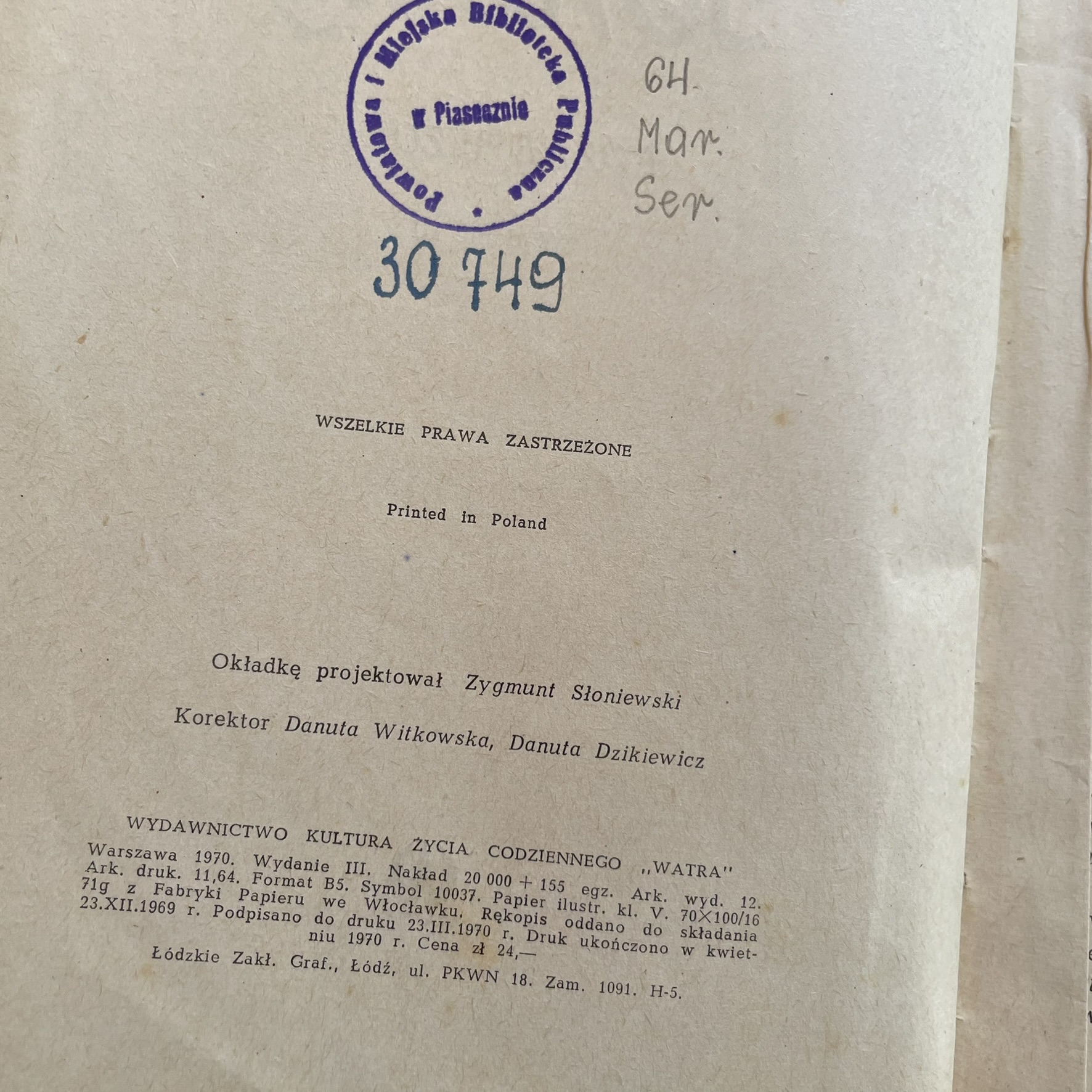 UWAGI: blok oddzielony od okładki, otarcia i zagięcia okładki, przybrudzenia okładki i kartek, oznaczenia pobiblioteczne